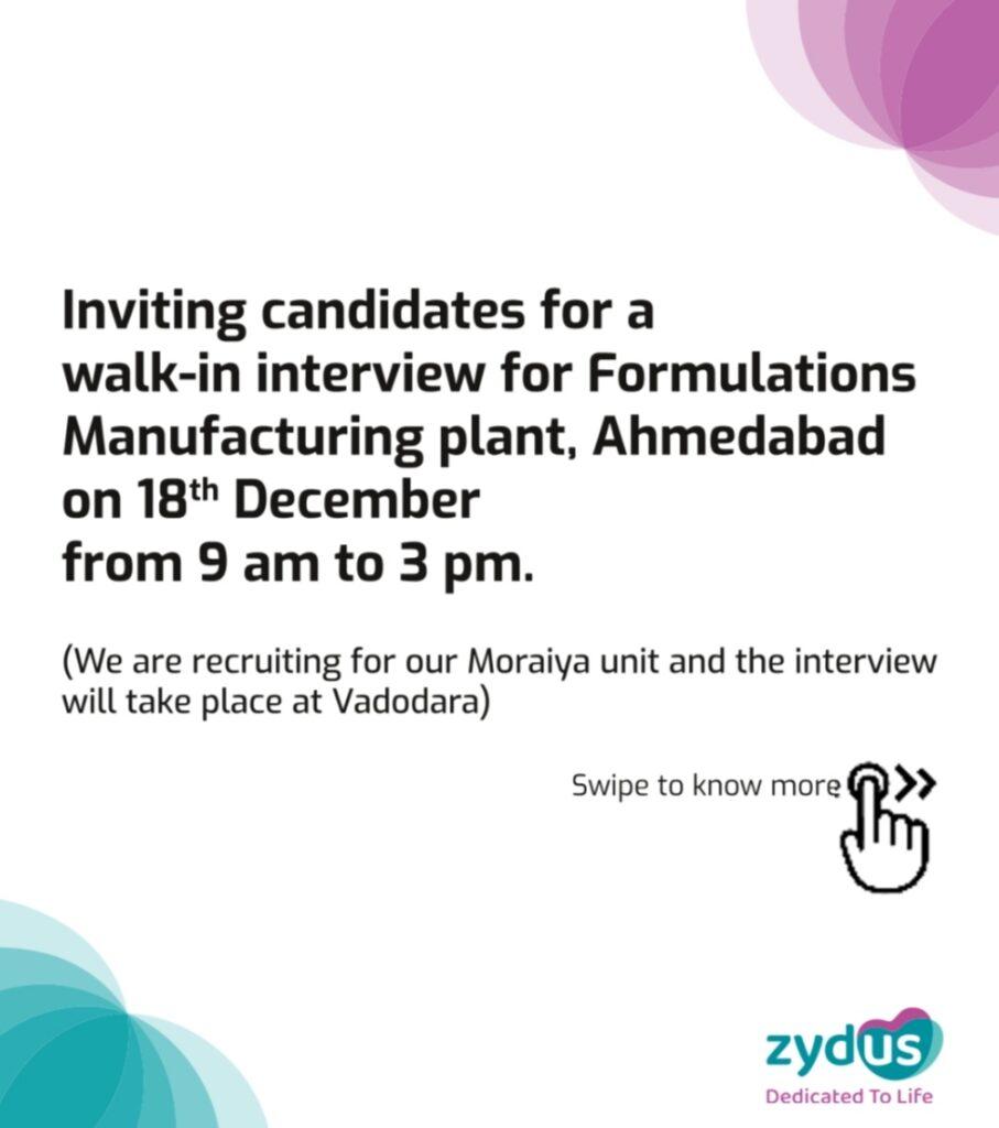 Inviting candidates for a walk-in interview for Formulations Manufacturing plant, Ahmedabad on 18th December from 9 am to 3 pm.