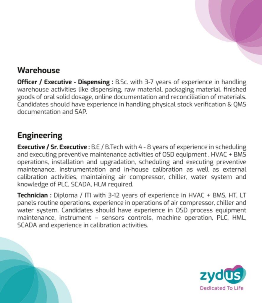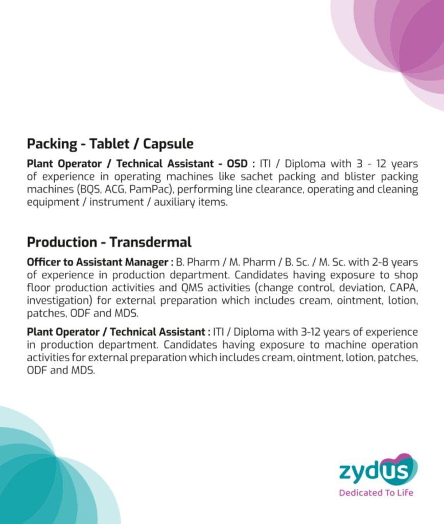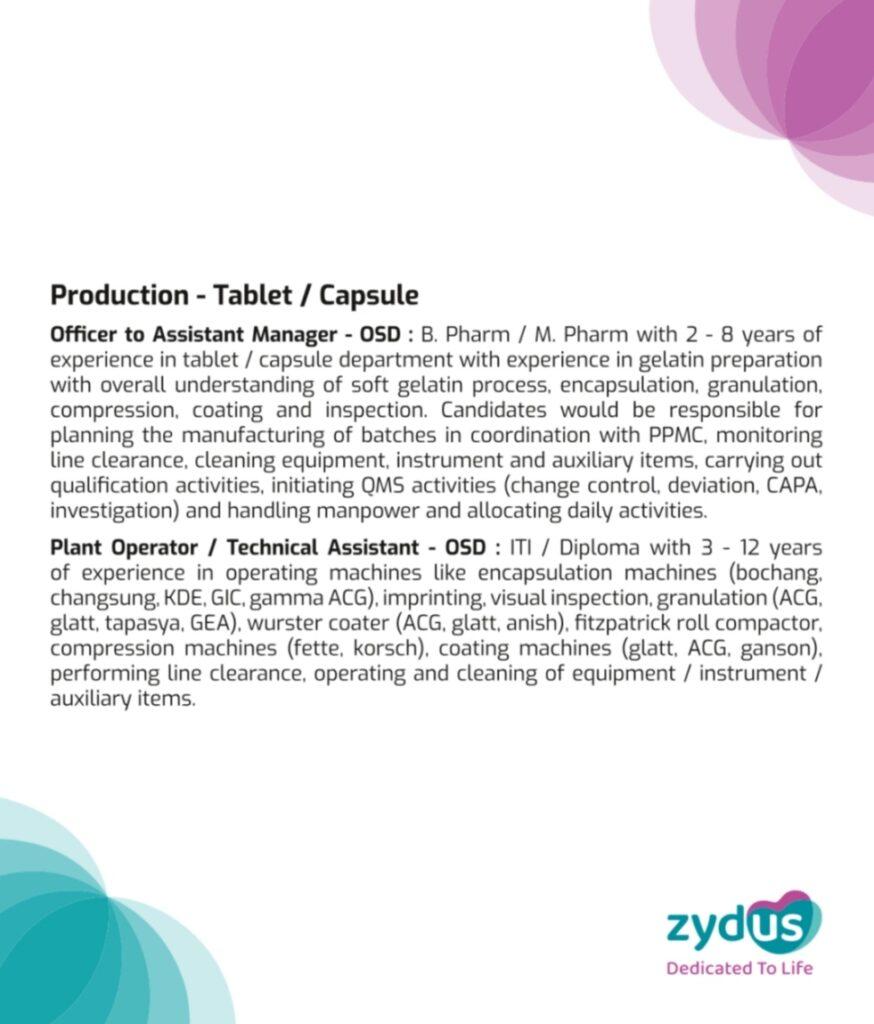 Zydus Group- Multiple opening- Production/Packing (Tablet/ Capsule), Warehouse, Engineering, QA, QC on 18th Dec 2022
