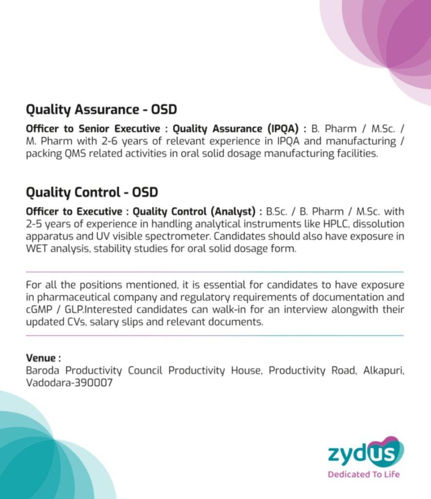 Officer to Senior Executive : Quality Assurance (IPQA): B. Pharm / M.Sc./ M. Pharm with 2-6 years of relevant experience in IPQA and manufacturing / packing QMS related activities in oral solid dosage manufacturing facilities.