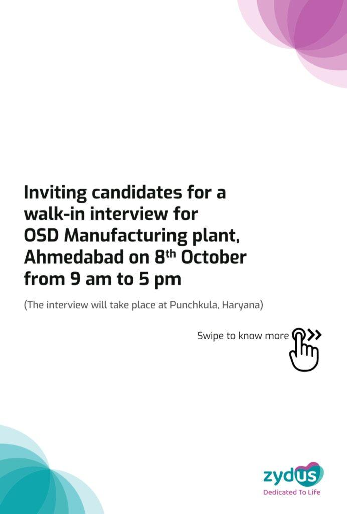 Zydus Group Walk-in interview at Punchkula, Haryana for OSD Manufacturing plant, Ahmedabad on 8th October 2023