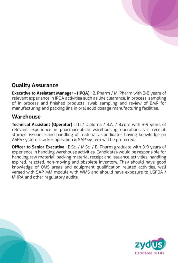 Technical Assistant (Operator): ITI / Diploma / B.A. / B.com with 3-9 years of relevant experience in pharmaceutical warehousing operations viz: receipt. storage, issuance and handling of materials. Candidates having knowledge on ASRS system, stacker operation & SAP system will be preferred.