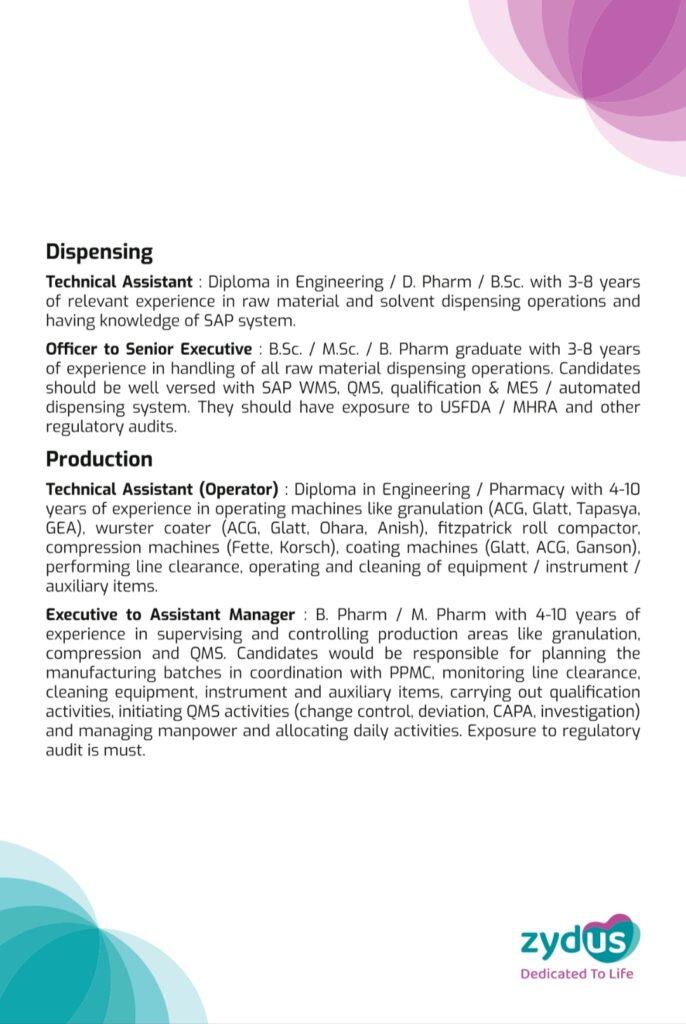 Technical Assistant: Diploma in Engineering / D. Pharm / B.Sc. with 3-8 years of relevant experience in raw material and solvent dispensing operations and having knowledge of SAP system.