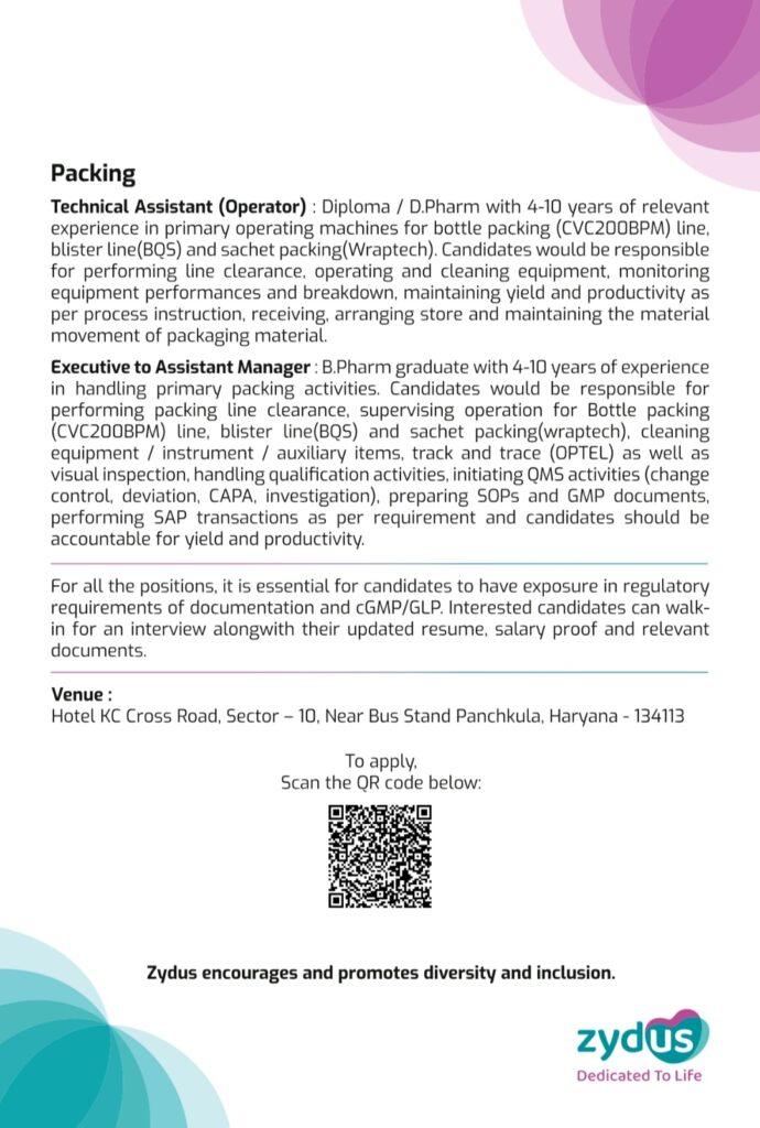 Technical Assistant (Operator): Diploma / D.Pharm with 4-10 years of relevant experience in primary operating machines for bottle packing (CVC200BPM) line, blister line(BQS) and sachet packing(Wraptech). Candidates would be responsible for performing line clearance, operating and cleaning equipment, monitoring equipment performances and breakdown, maintaining yield and productivity as per process instruction, receiving, arranging store and maintaining the material. movement of packaging material.