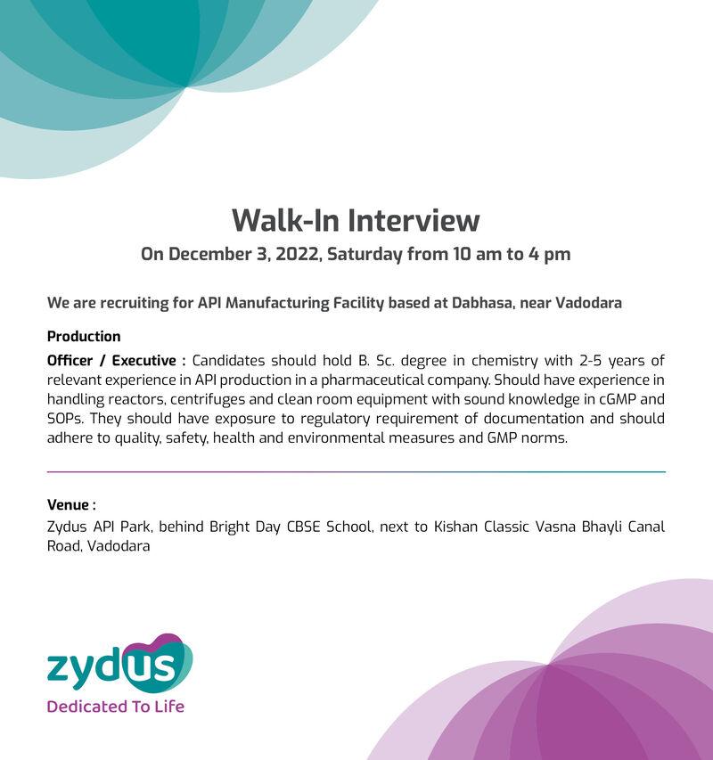 Zydus Group walk-in interview for our API manufacturing facility based at Dabhasa, near Vadodara on December 3, 2022