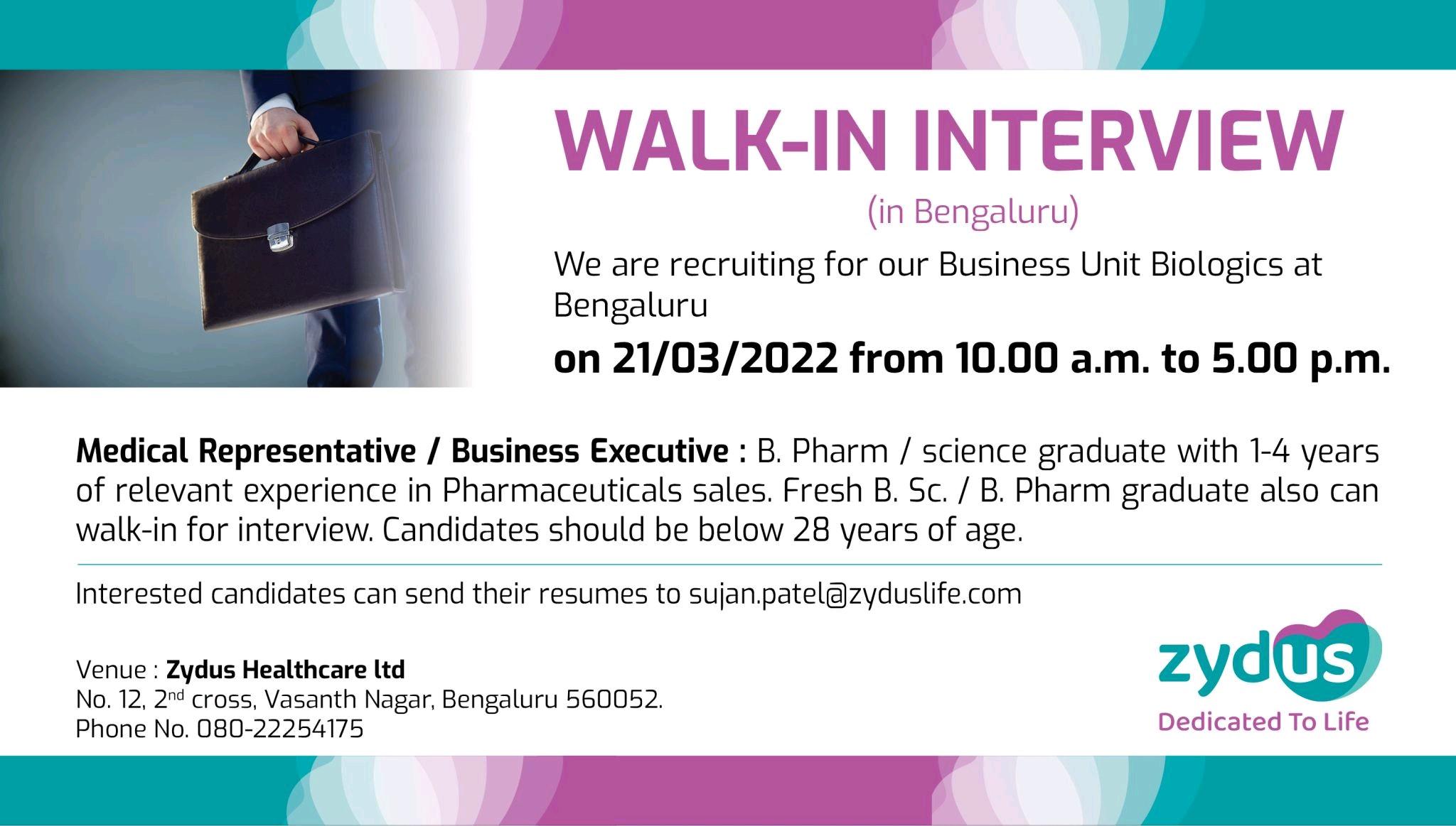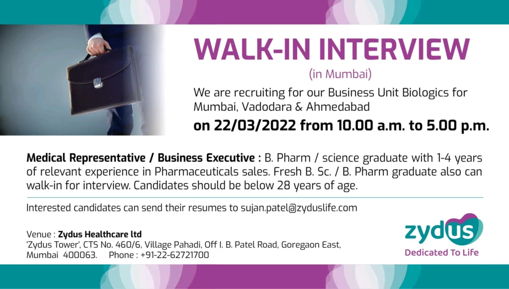 Zydus Healthcare Freshers & Experience Walk in interview for Medical Representatives/ Business Executive & engineering department on 20th, 21st & 22nd March 2022