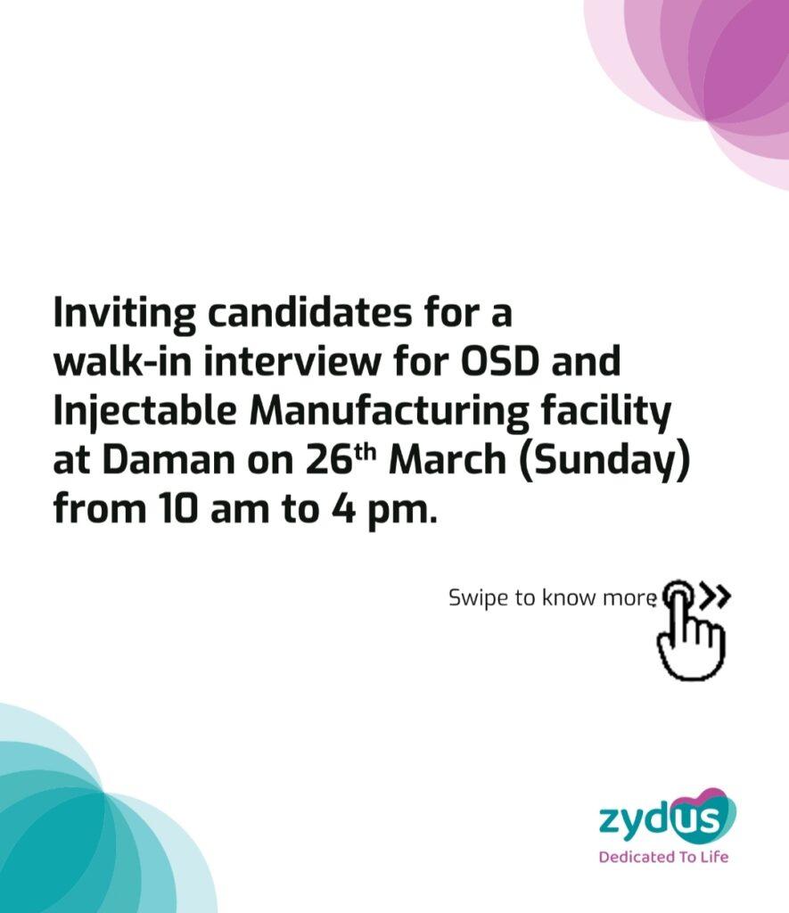 Zydus Healthcare Limited- Walk-in interview for OSD and Injectable Manufacturing facility at Daman on 26th March (Sunday)