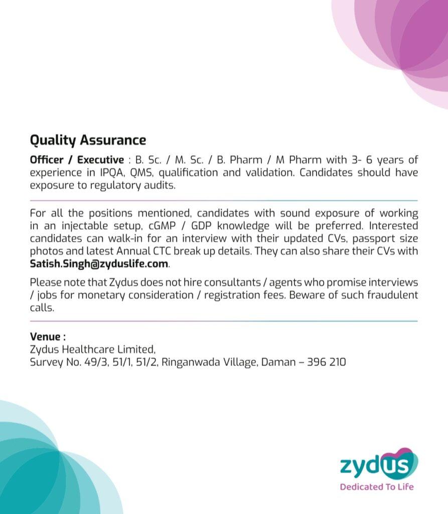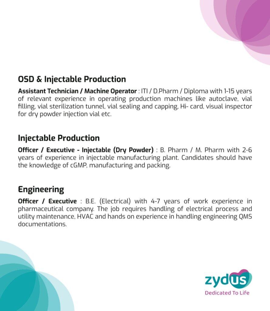 For all the positions mentioned, candidates with sound exposure of working in an injectable setup, cGMP/GDP knowledge will be preferred. Interested candidates can walk-in for an interview with their updated CVs, passport size photos and latest Annual CTC break up details. They can also share their CVs with Satish.Singh@zyduslife.com.