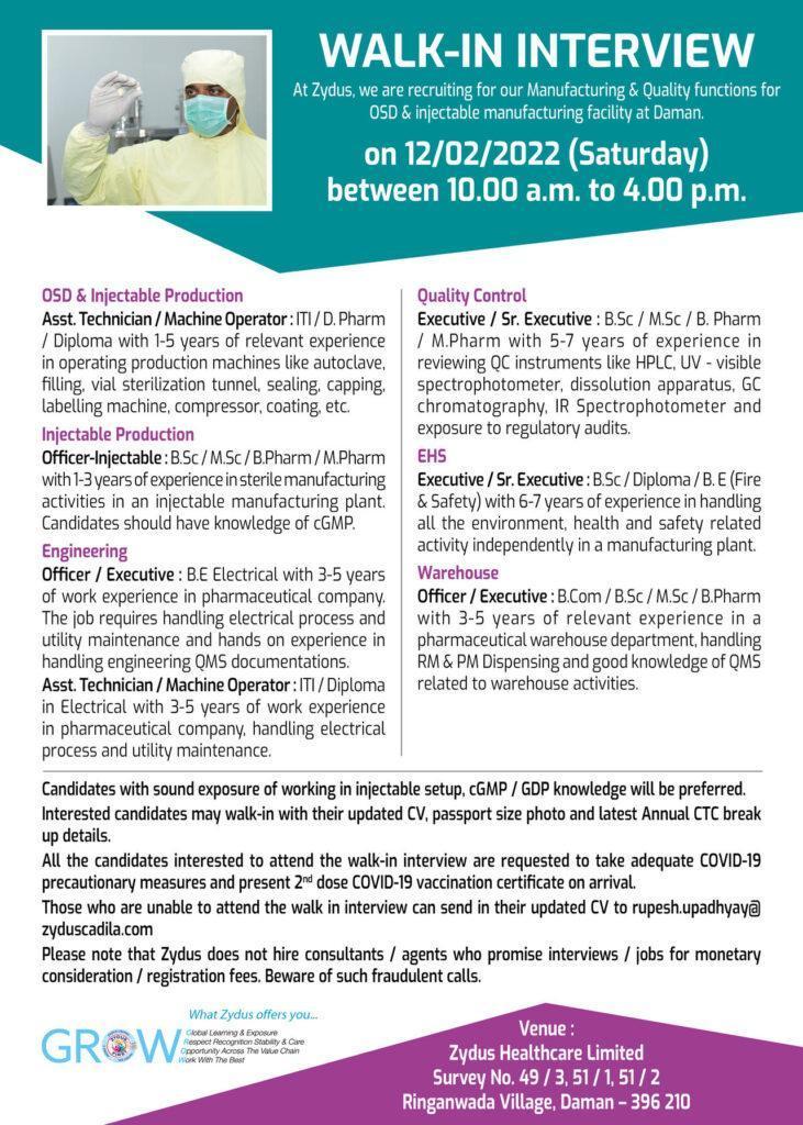 Zydus Healthcare Limited, Walk-In Interviews for Production / Quality Control / Engineering / EHS & Warehouse Department on 12th Feb’ 2022