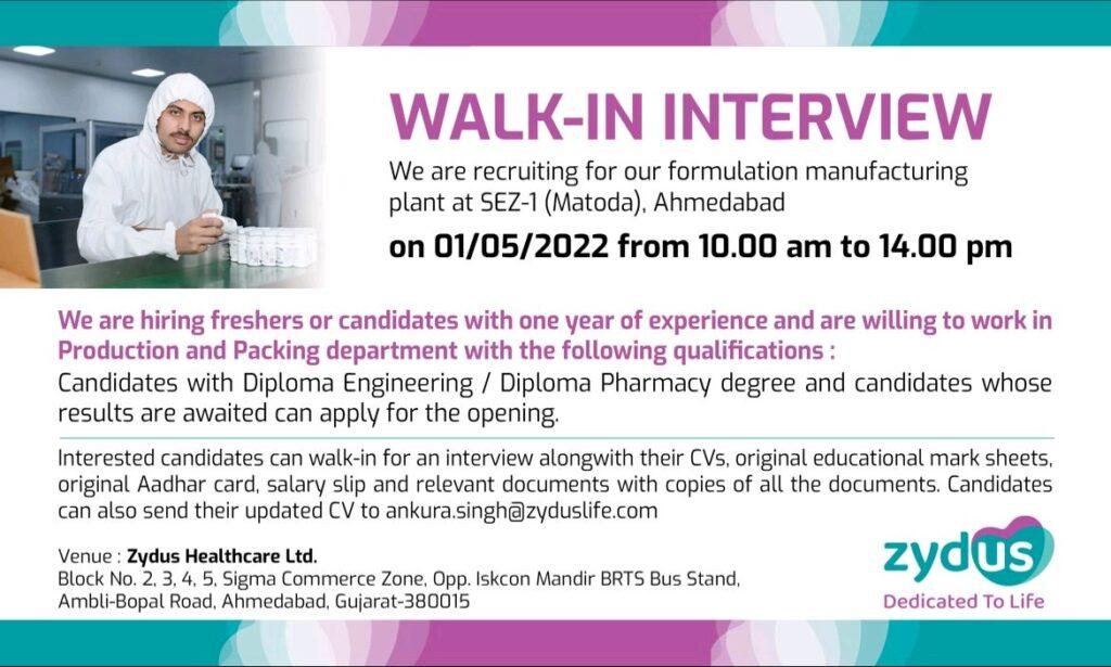 Zydus Healthcare Ltd. Walk-in for Fresher and upto 1 years experience Diploma Engineering / Diploma Pharmacy degree candidates on 1st May, 2022 (Sunday)