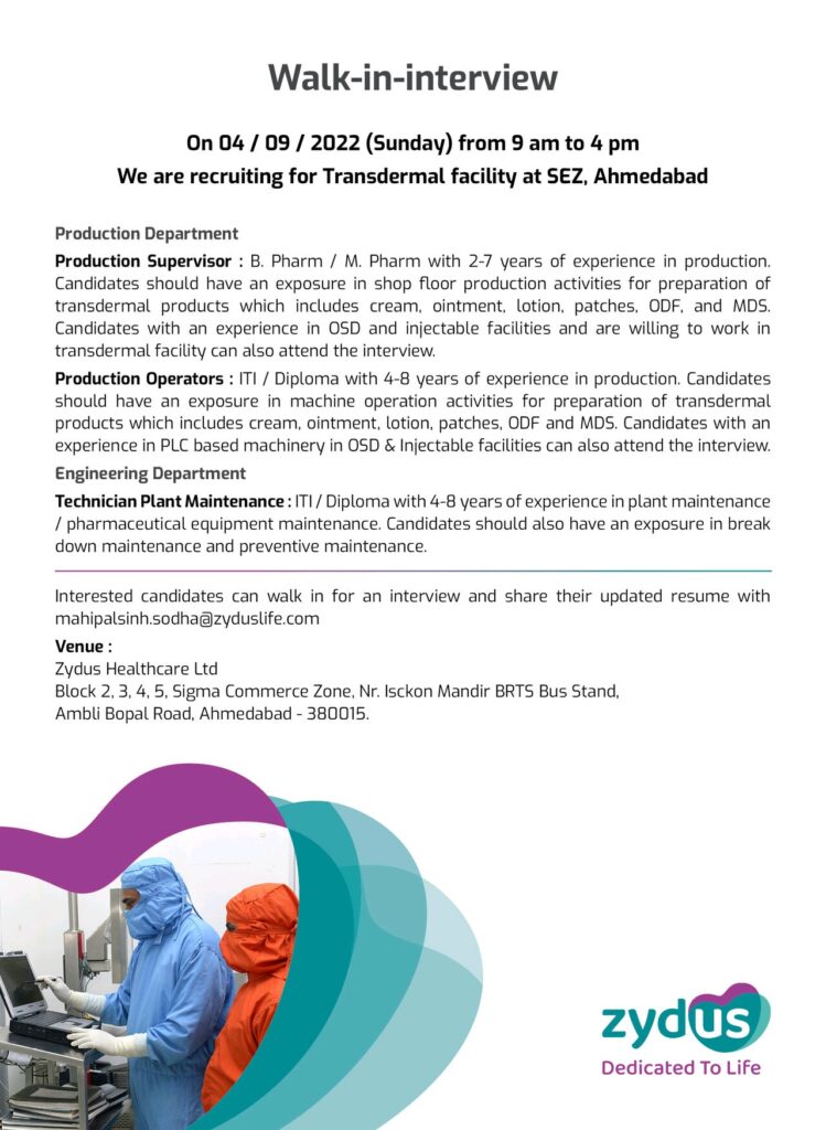 Interested candidates can walk in for an interview and share their updated resume with mahipalsinh.sodha@zyduslife.com