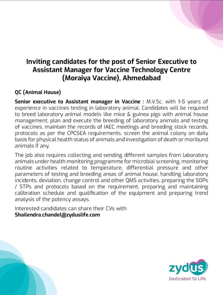 Zydus- hiring Senior Executive to Assistant Manager for Vaccine Technology Centre (Moraiya Vaccine), Ahmedabad