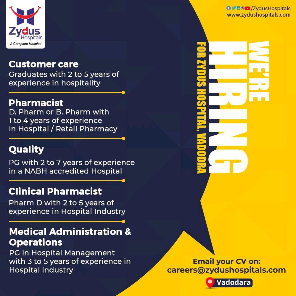 If you are looking forward to pursue your career in Customer Care, Pharmacy, Quality Assurance, Clinical Pharmacy or Medical Administration & Operations then email your CV on: careers@zydushospitals.com at the earliest.