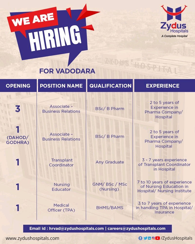 Zydus Hospitals, Vadodara is Hiring for multiple positions.