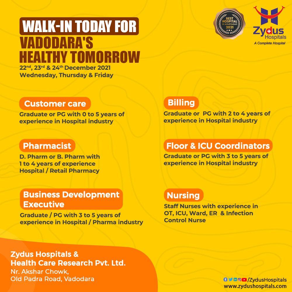 Zydus Hospitals, Walk In Interview for D.Pharm/ B.Pharm/ Graduates or PG Candidates on 22nd, 23rd & 24th Dec’ 2021