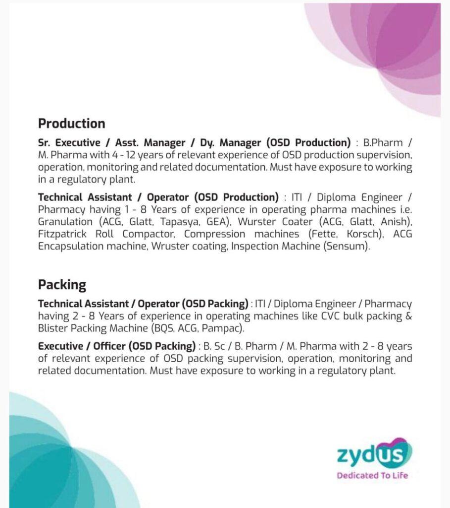 Sr. Executive / Asst. Manager / Dy. Manager (OSD Production): B.Pharm / M. Pharma with 4-12 years of relevant experience of OSD production supervision, operation, monitoring and related documentation. Must have exposure to working in a regulatory plant.