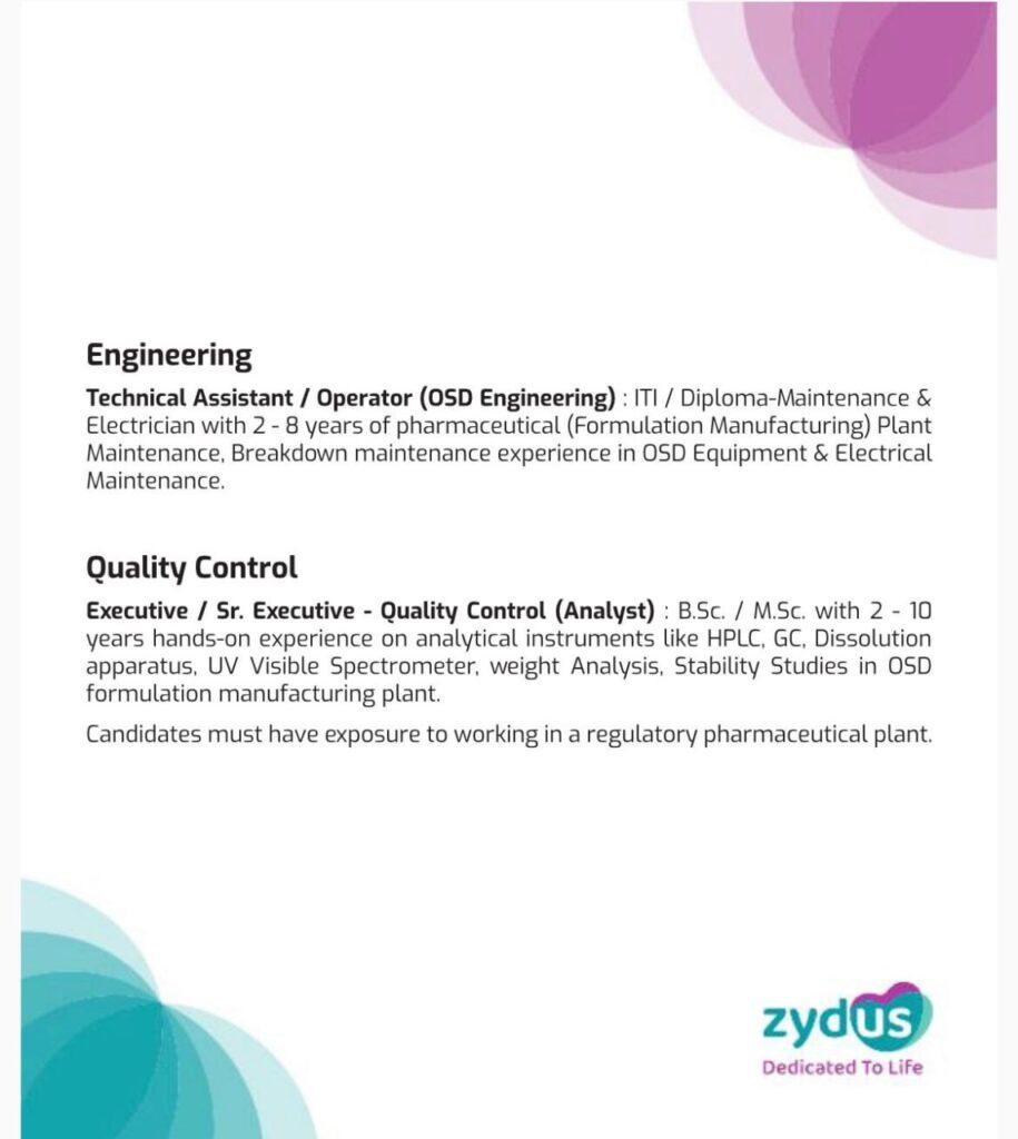 Executive / Sr. Executive – Quality Control (Analyst): B.Sc. / M.Sc. with 2-10 years hands-on experience on analytical instruments like HPLC, GC, Dissolution apparatus, UV Visible Spectrometer, weight Analysis, Stability Studies in OSD formulation manufacturing plant.