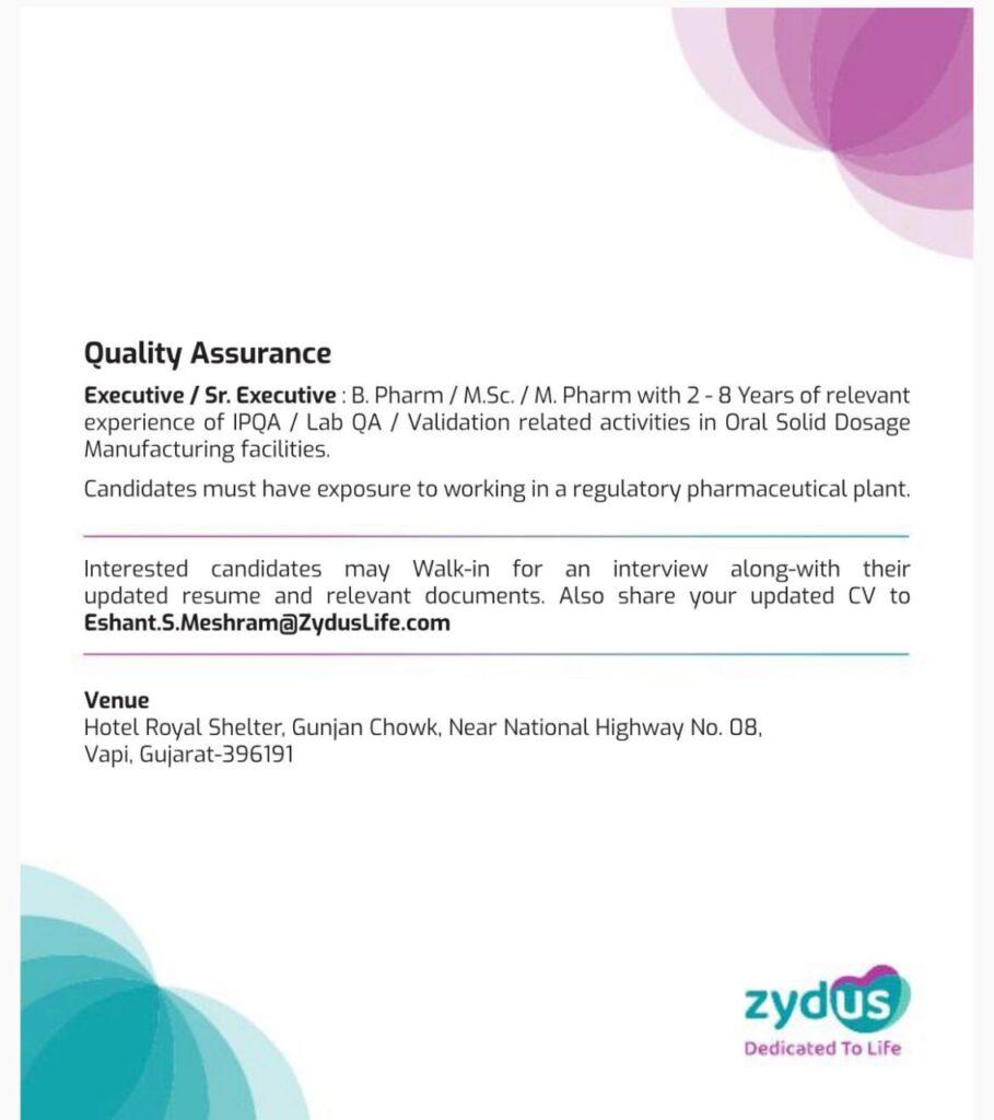 Zydus Lifescience Recruited Drive at “Vapi-Gujarat” on 6th & 7th May’23
