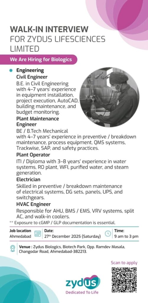 Zydus Lifesciences Limited, a leading global life sciences company, has announced an upcoming walk-in interview drive specifically for its Biologics unit. This recruitment drive is focused on strengthening their engineering and maintenance teams at their Ahmedabad facility. If you are an experienced professional in civil engineering, plant maintenance, or HVAC systems within the pharmaceutical sector, this is a significant opportunity to join a premier organization dedicated to life-saving healthcare solutions.