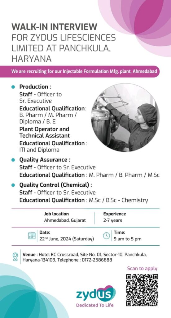 For all the positions it is essential for candidates to have exposure in Injectable Sterile plant and regulatory requirements of documentation as per cGMP/GLP.