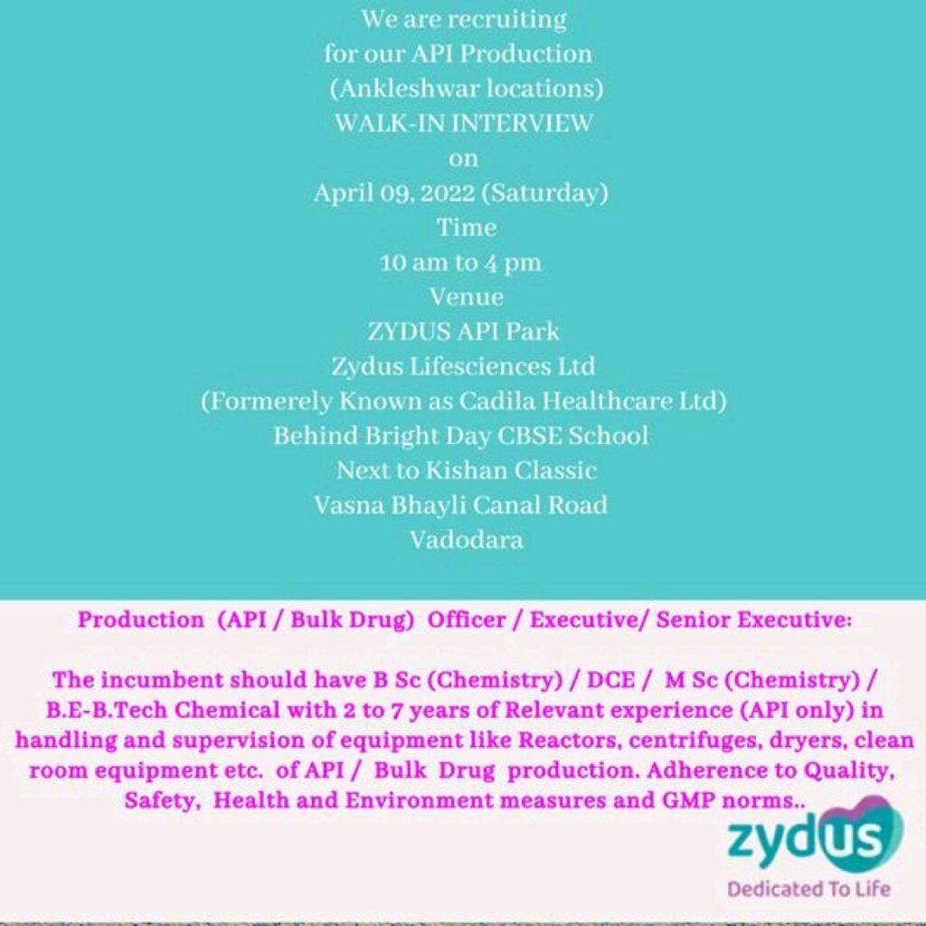 Zydus Lifesciences Ltd Walk In Interview for Production (API / Bulk Drug) Officer / Executive/ Senior Executive on April 09, 2022