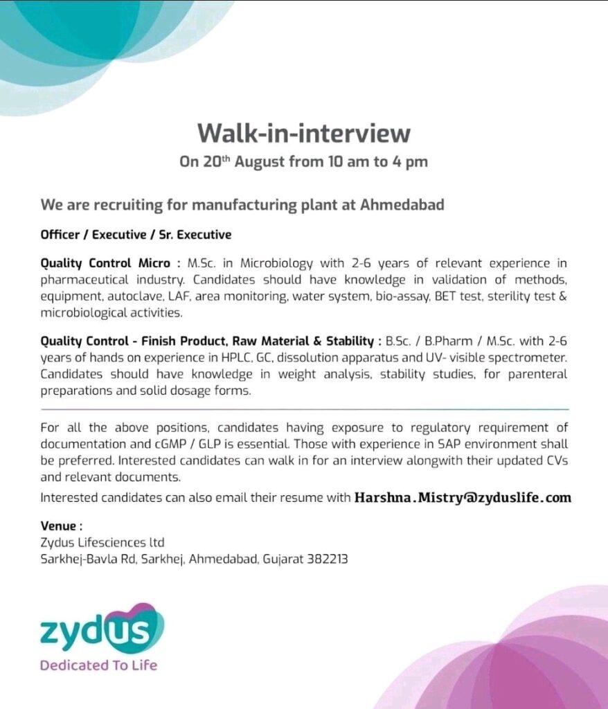 Zydus Lifesciences ltd. Walk-in-interview on 20th August 2022