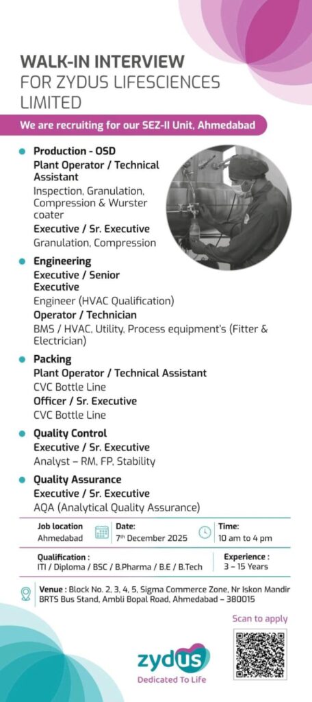 Zydus Lifesciences Limited, a leading name in the global pharmaceutical industry, is conducting a Mega Walk-In Interview for experienced professionals to join its state-of-the-art SEZ-II Unit in Ahmedabad. This is an excellent opportunity for candidates with 3 to 15 years of experience in OSD (Oral Solid Dosage) and regulated manufacturing environments.