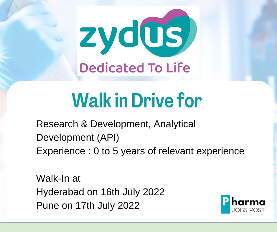Zydus – Walk-In at Hyderabad on 16th July And at Pune on 17th July 2022 – Freshers & experience