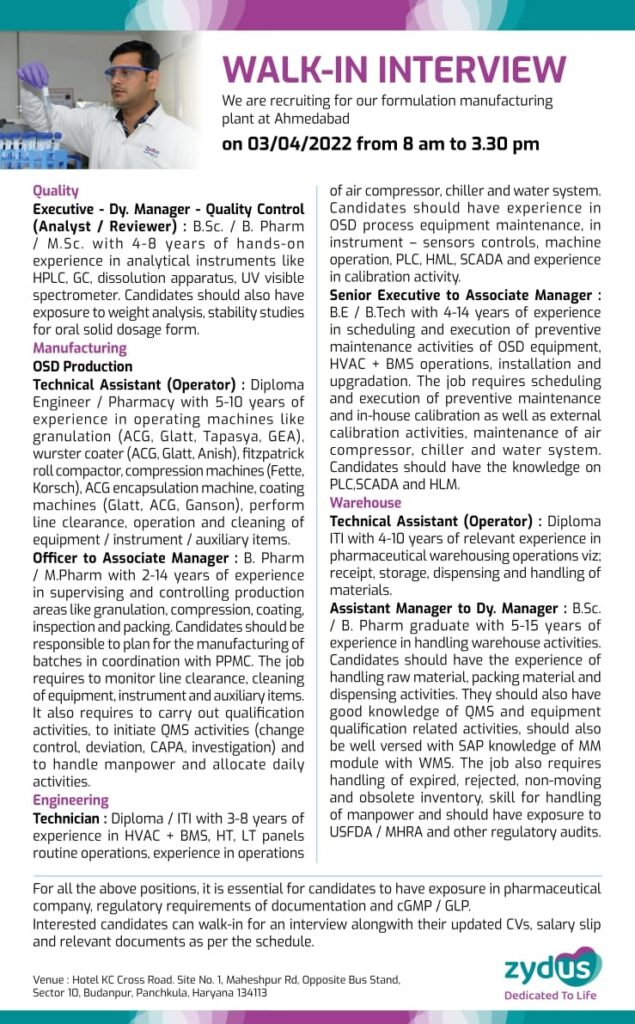 Zydus Walk In Interview for Quality, Production, Warehouse & engineering on 03/04/2022 @Panchkula, Haryana