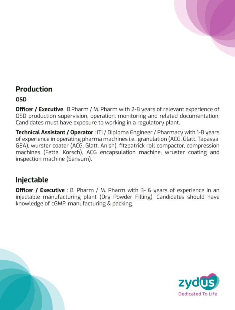 Officer / Executive: B.Pharm/ M. Pharm with 2-8 years of relevant experience of OSD production supervision, operation, monitoring and related documentation. Candidates must have exposure to working in a regulatory plant.