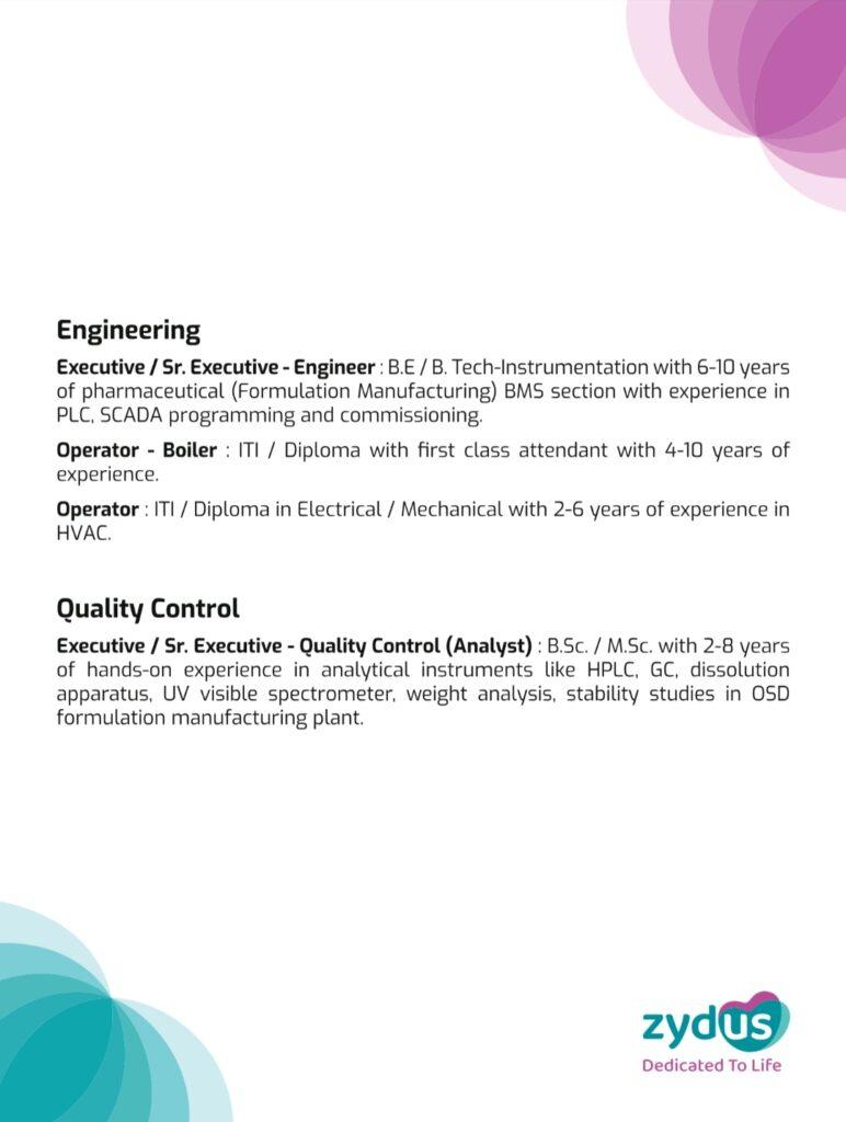 Executive / Sr. Executive – Quality Control (Analyst): B.Sc./ M.Sc. with 2-8 years of hands-on experience in analytical instruments like HPLC, GC, dissolution apparatus, UV visible spectrometer, weight analysis, stability studies in OSD formulation manufacturing plant.