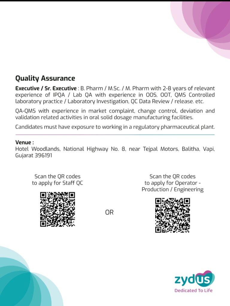 Scan the QR codes to apply for Operator – Production / Engineering or check link https://zydusgroup.darwinbox.in/ms/candidate/careers/a61f4e5dc3c0f1/custom_source/Vapi%20walk%20in%20Operator