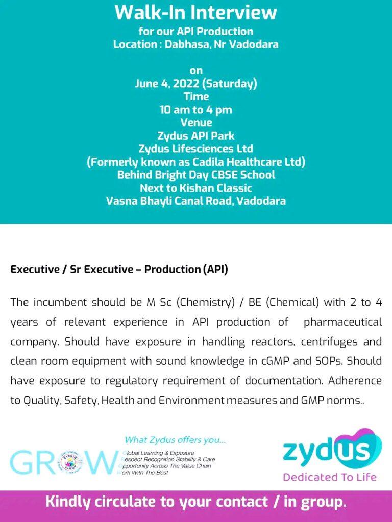 Zydus Walk-In Interview for Executive / Sr Executive – Production (API) on June 4, 2022