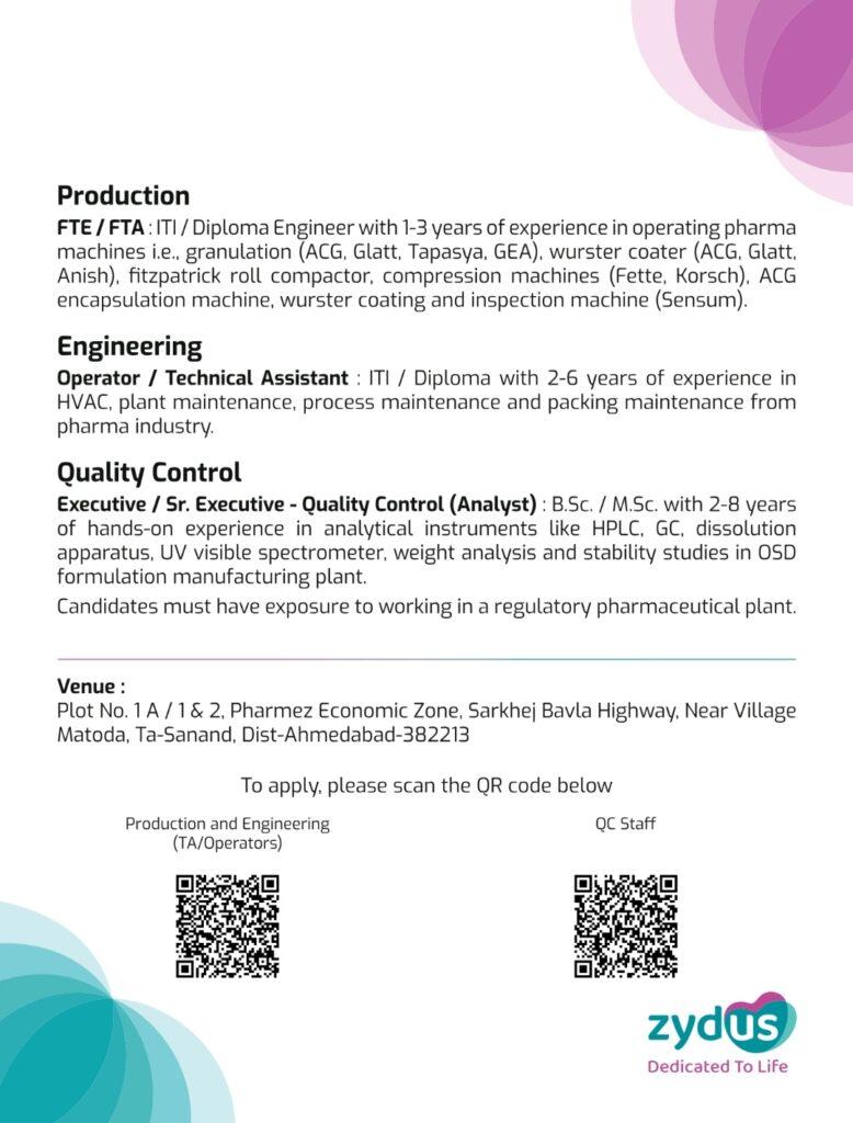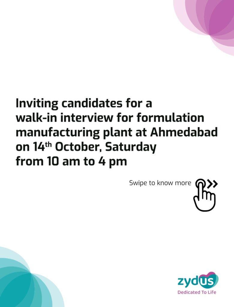 Zydus walk-in interview for formulation manufacturing plant at Ahmedabad on 14th October 2023
