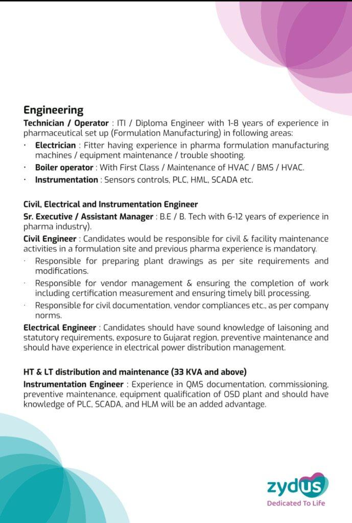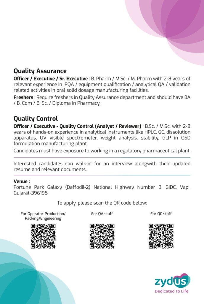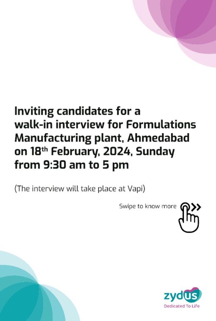 Zydus walk-in interview for Formulations Manufacturing plant, Ahmedabad on 18th February, 2024 @ GIDC, Vapi