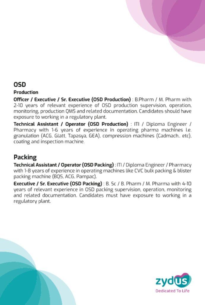 Executive / Sr. Executive (OSD Packing): B. Sc / B. Pharm / M. Pharma with 4-10 years of relevant experience in OSD packing supervision, operation, monitoring and related documentation. Candidates must have exposure to working in a regulatory plant.