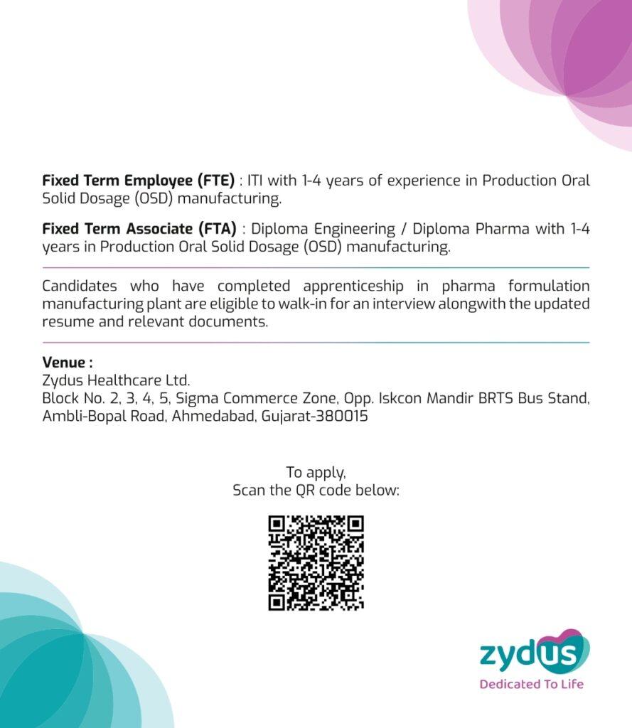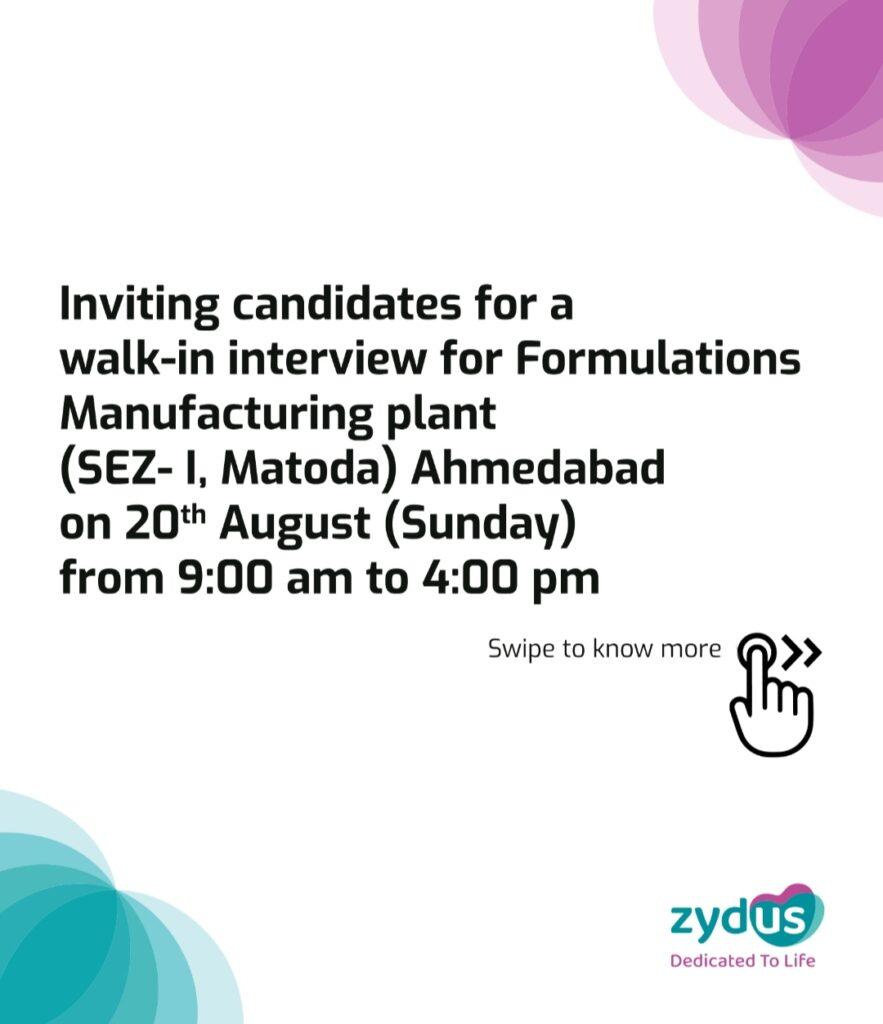 Zydus walk-in interview for Formulations Manufacturing plant, Ahmedabad on 20th August (Sunday)