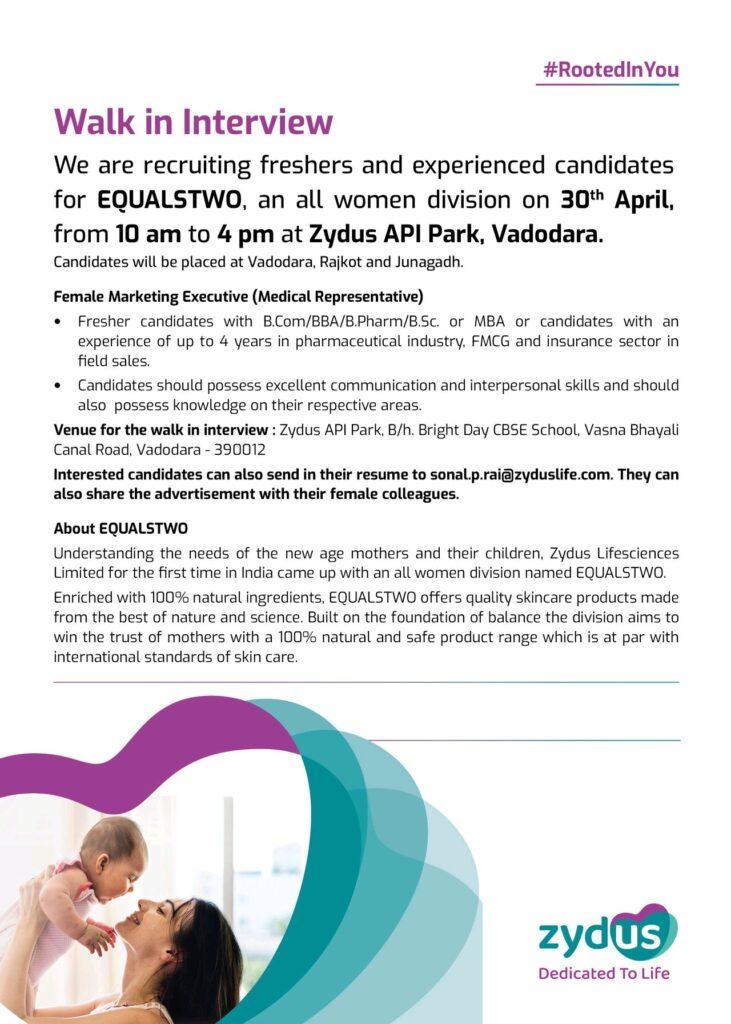 We are recruiting freshers and experienced candidates for EQUALSTWO, an all women division on 30th April, from 10 am to 4 pm at Zydus API Park, Vadodara. Candidates will be placed at Vadodara, Rajkot and Junagadh.