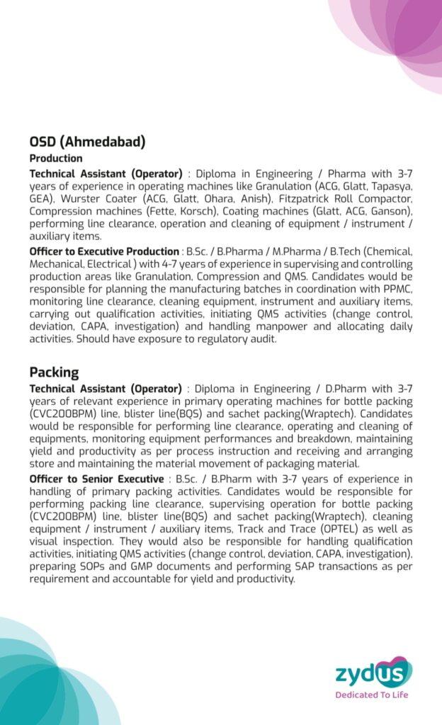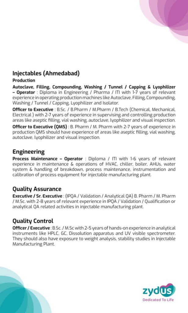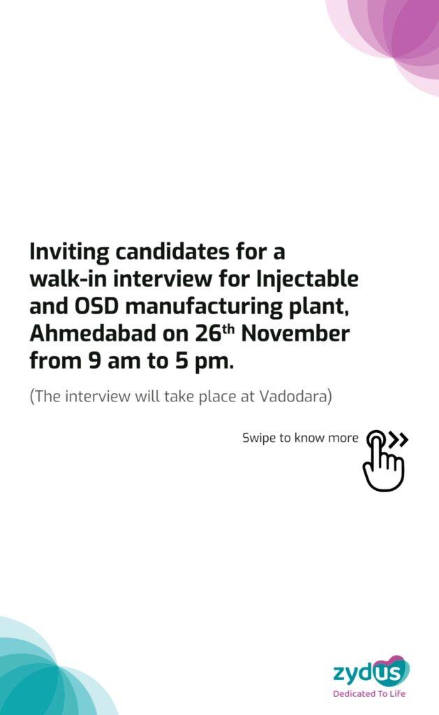 Zydus walk-in interview for Injectable and OSD manufacturing plant, Ahmedabad on 26th November 2023