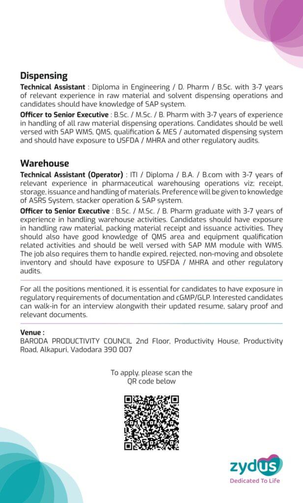 Technical Assistant (Operator): ITI / Diploma / B.A. / B.com with 3-7 years of relevant experience in pharmaceutical warehousing operations viz; receipt. storage, issuance and handling of materials. Preference will be given to knowledge of ASRS System, stacker operation & SAP system.