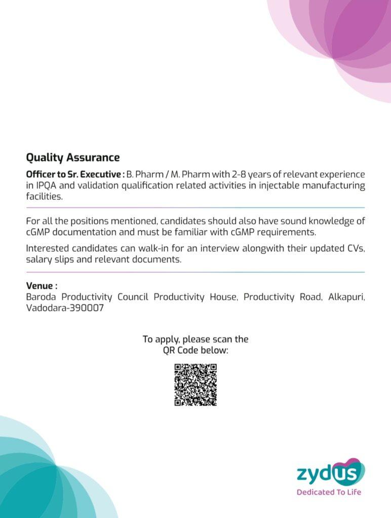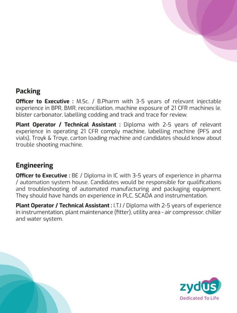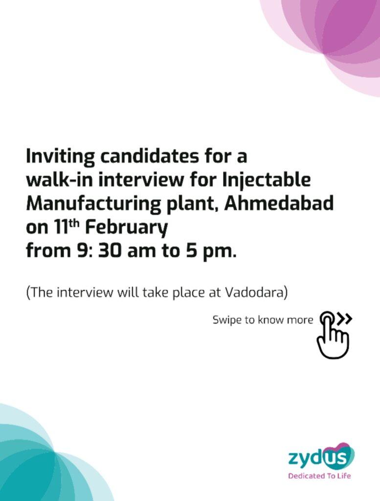 Zydus walk-in interview for Injectable Manufacturing plant, Ahmedabad on 11th February 2024