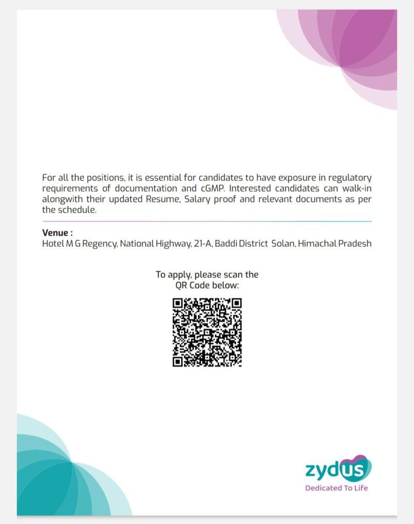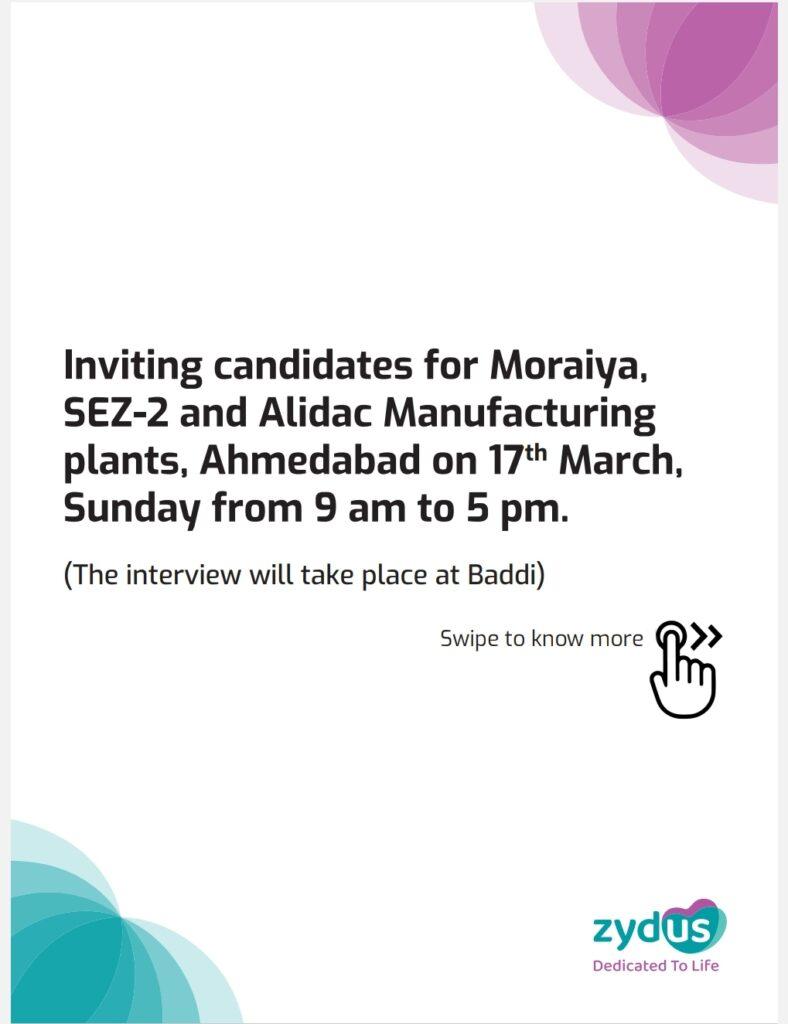 Zydus walk in interview for Manufacturing plants, Ahmedabad on 17th March, Sunday || Interview will take place at Baddi