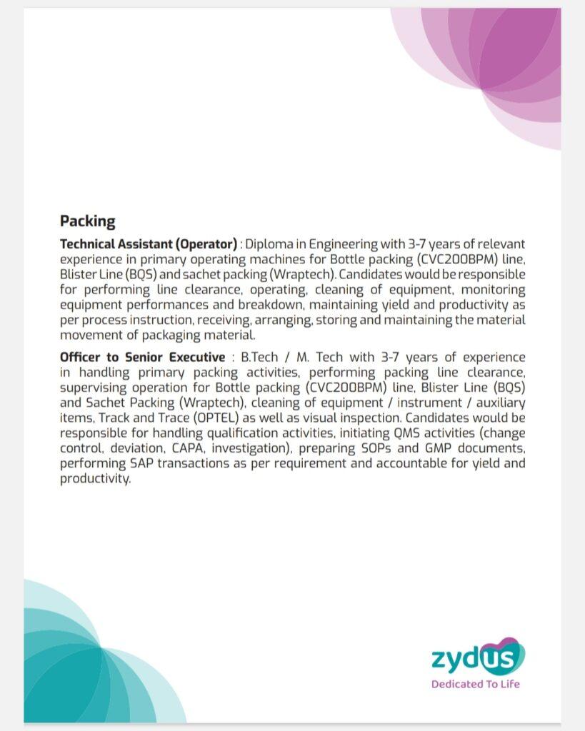 Technical Assistant (Operator): Diploma in Engineering with 3-7 years of relevant experience in primary operating machines for Bottle packing (CVC200BPM) line, Blister Line (BQS) and sachet packing (Wraptech). Candidates would be responsible for performing line clearance, operating, cleaning of equipment, monitoring equipment performances and breakdown, maintaining yield and productivity as per process instruction, receiving, arranging, storing and maintaining the material movement of packaging material.