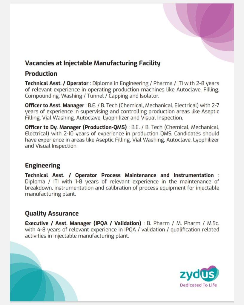 Officer to Dy. Manager (Production-QMS): B.E. / B. Tech (Chemical, Mechanical, Electrical) with 2-10 years of experience in production QMS. Candidates should have experience in areas like Aseptic Filling. Vial Washing, Autoclave, Lyophilizer and Visual Inspection.