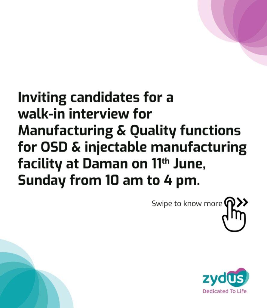 Zydus – Walk-in interview for Manufacturing & Quality functions for OSD & injectable manufacturing facility at Daman on 11th June, Sunday