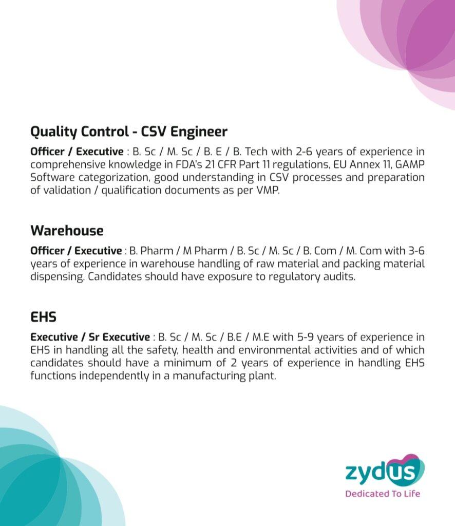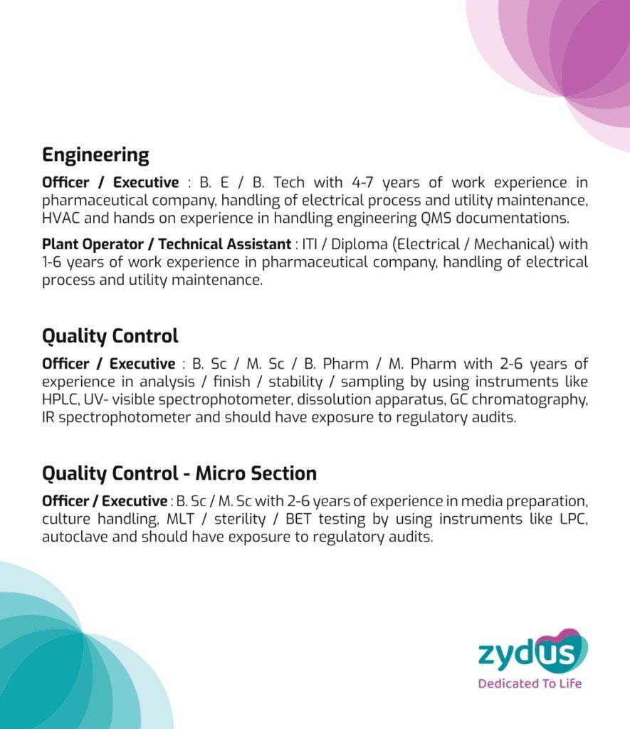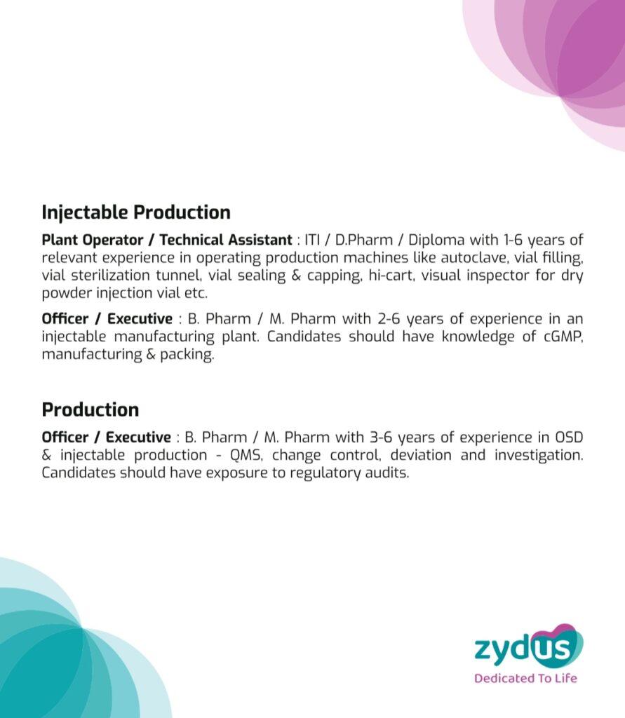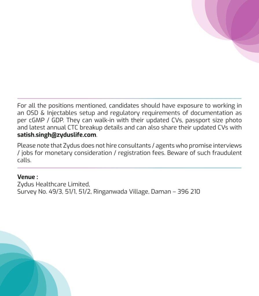 For all the positions mentioned, candidates should have exposure to working in an OSD & Injectables setup and regulatory requirements of documentation as per cGMP/GDP. They can walk-in with their updated CVs, passport size photo and latest annual CTC breakup details and can also share their updated CVs with satish.singh@zyduslife.com.